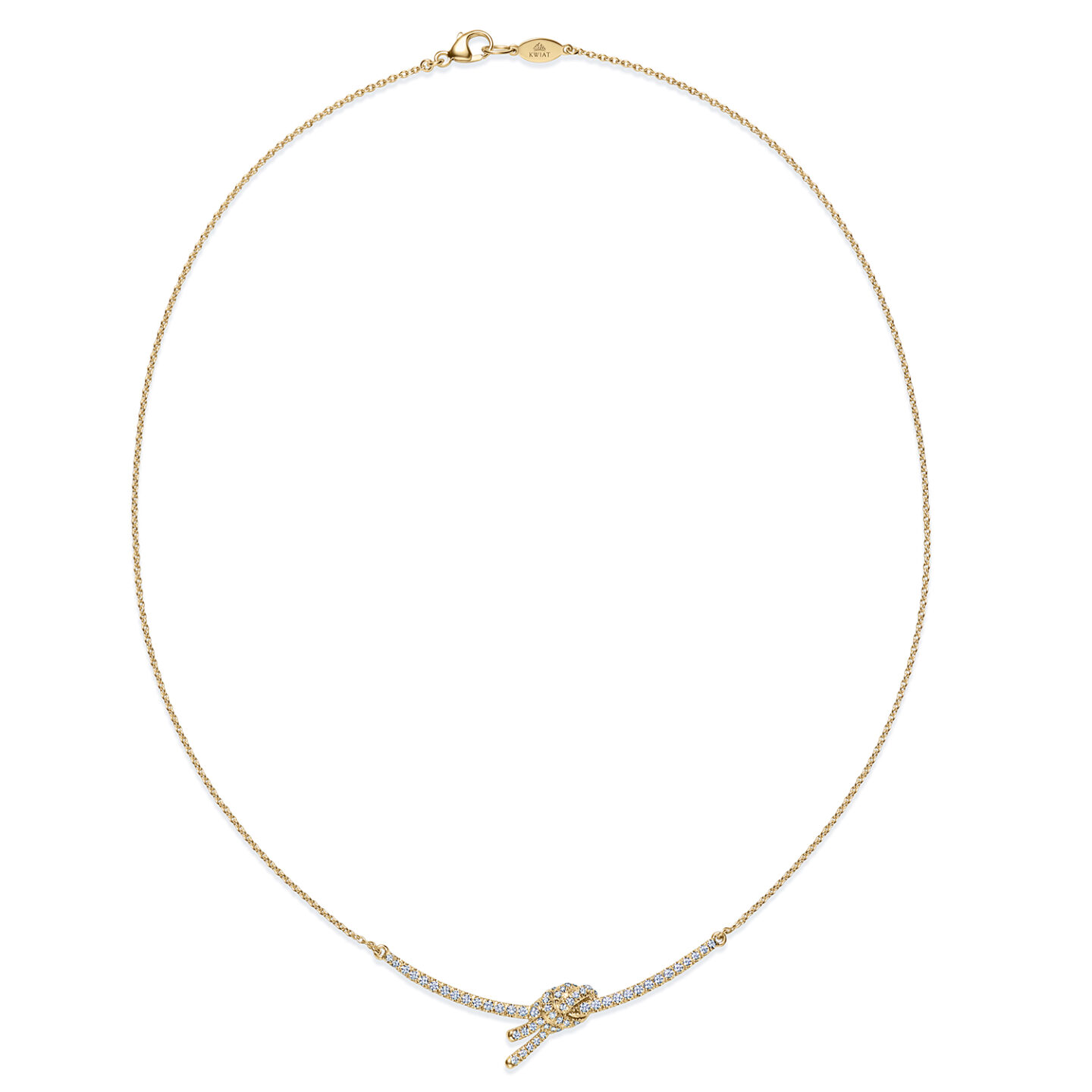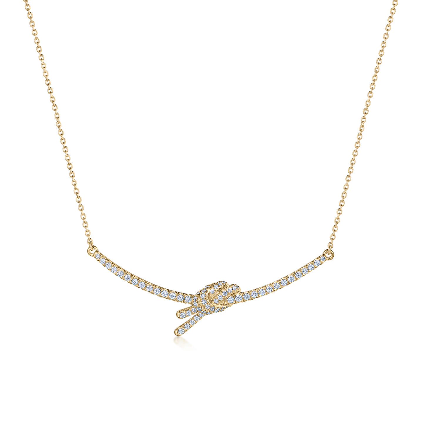 A curved bar of pavé diamonds set in 18K yellow gold gathers into a loose twist that moves and sparkles with subtlety.