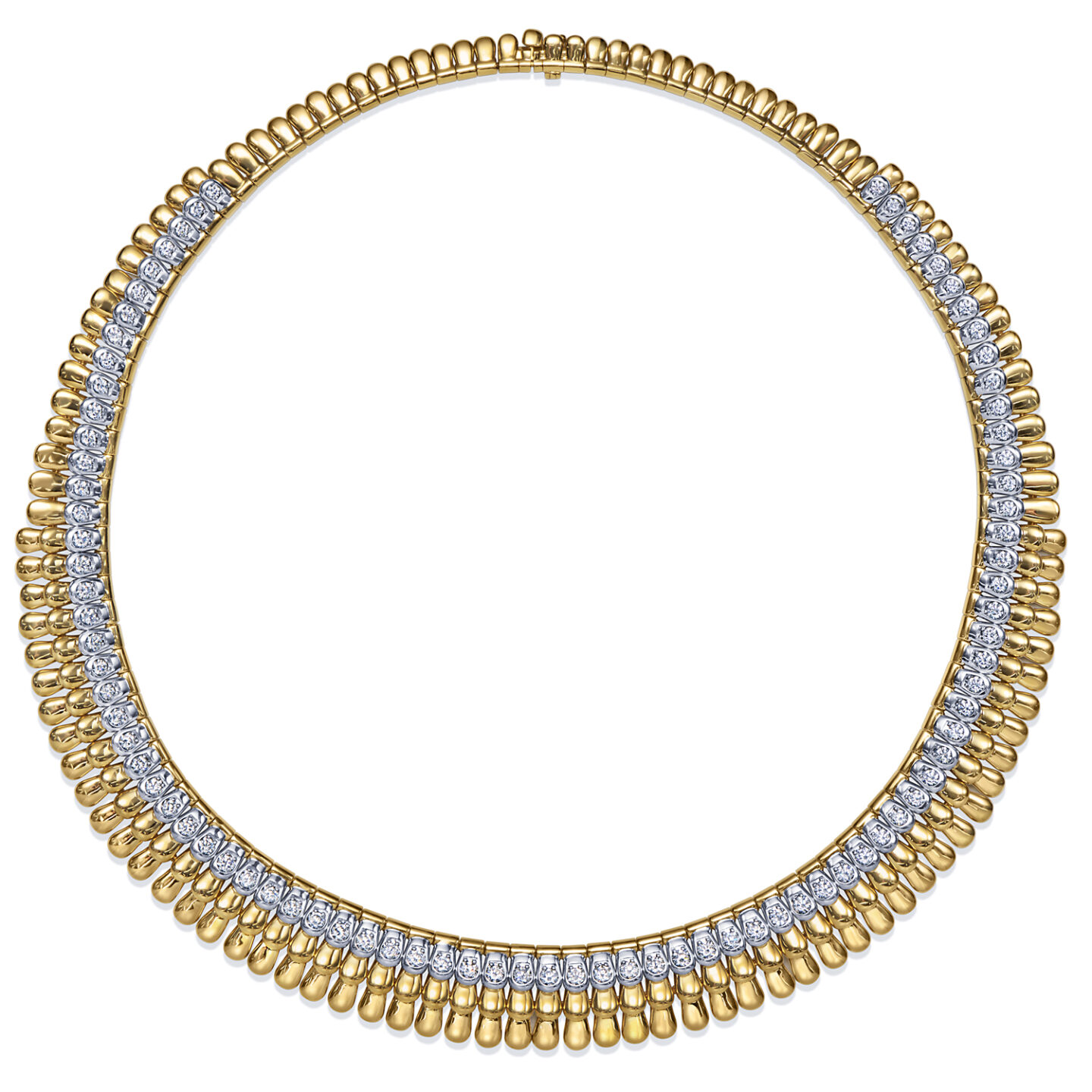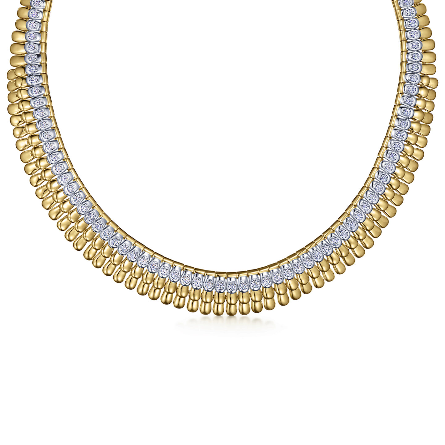Sirena means “mermaid” in Spanish, Italian, and other Romance languages. The elegant scales of a mermaid’s tail inspire a breathtaking statement necklace of 18K yellow gold scallops edged in 18K white gold set with diamonds. Sleek and modern, yet absolutely timeless.